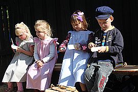 • Måske flække et større stykke træ og snitte en smørekniv eller en brummer (dette kræver at børnene har snittet før)